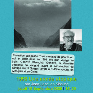 Projection composée d'une centaine de photos en noir et blanc prise en 1993 lors d'un voyage en train: Genève Shanghai Genève, la dernière descente du Yangtsé avant la construction du barrage des 3 Gorges, arrêts à St-Pétersbourg, en Mongolie et en Chine.