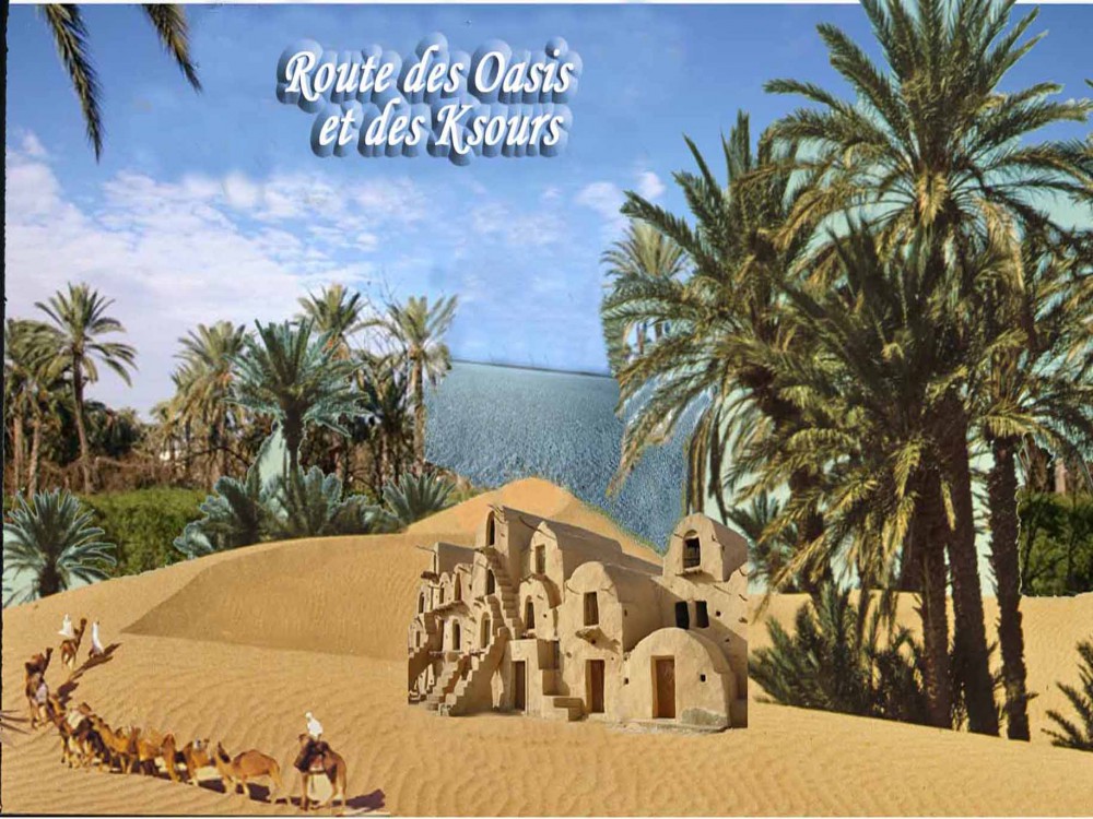 Le chott Djérid le plus grand lac salé d'Afrique , douz Kébili son marché de dromadaires , Chénini ses maisons troglodytes de montagne , mamata ,ses maisons troglodytes sous terre, Gabès la seule oasis maritimeproposée par
